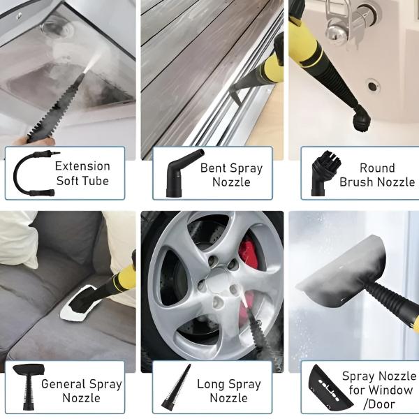 A csomag tartalmaz keféket, fúvókákat és párnákat padló, fuga, ablakok és sok más tisztításához.
