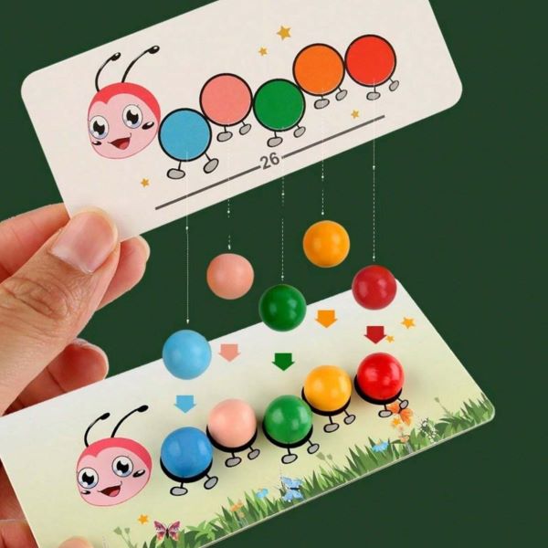 Ez a készlet számos fából készült gyöngyöt tartalmaz, amelyeket úgy lehet elrendezni, hogy egy élénk hernyót építsenek belőlük.